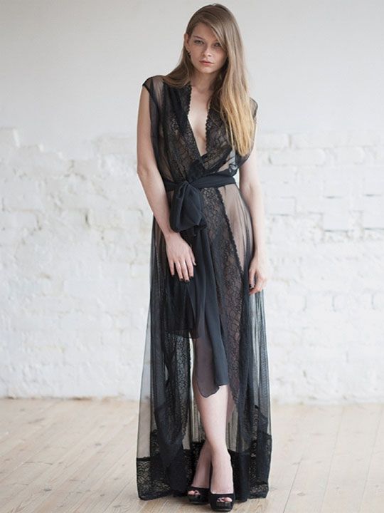 Роскошный халат из сетчатой ткани украшен кружевом. Широкий пояс из этой же ткани подхватывает талию. От обнаженного тела, прикрытого полупрозрачной тканью, захватывает дух.