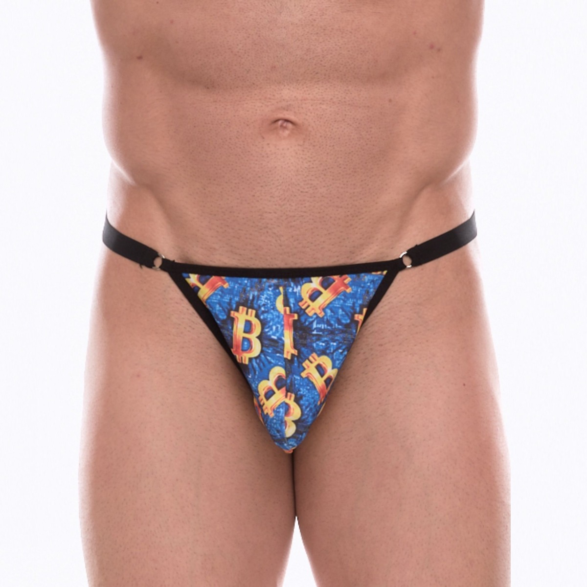 Синие мужские трусы-тонги с разноцветным принтом.Характеристики