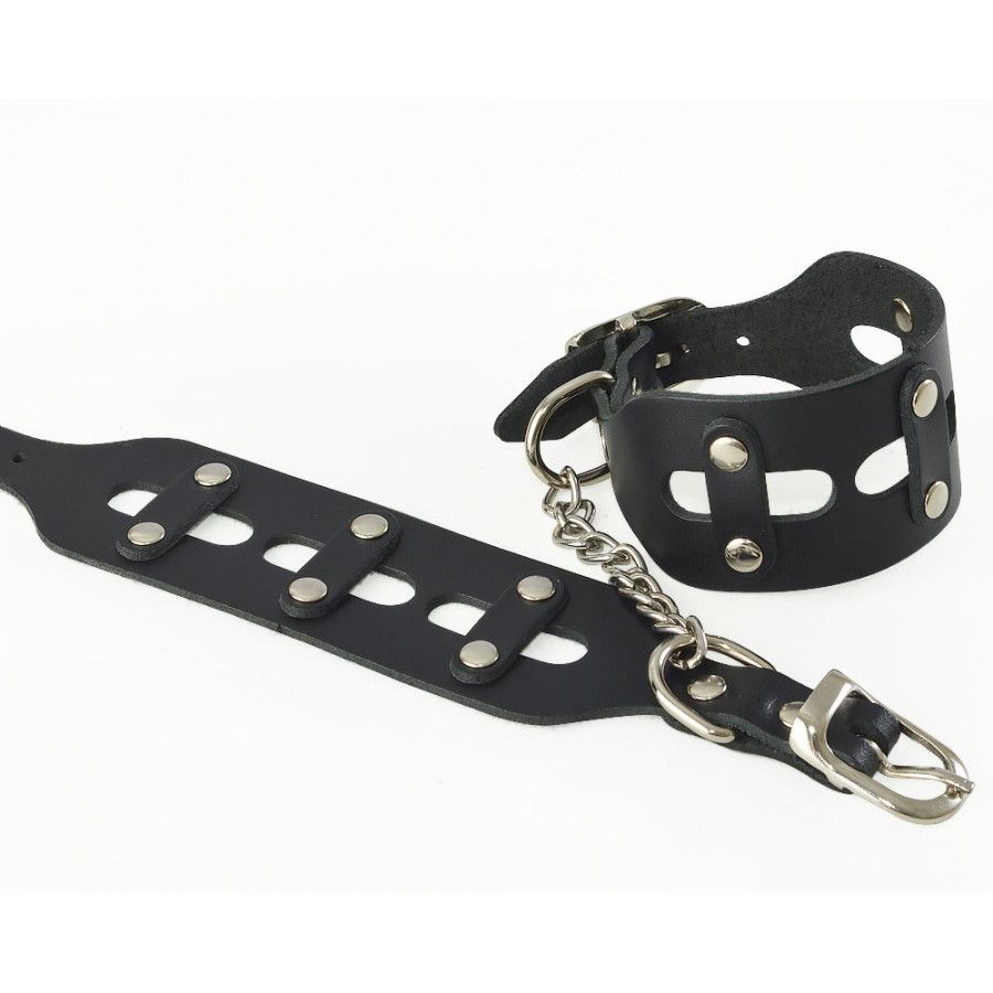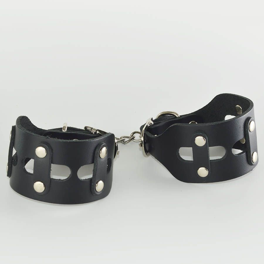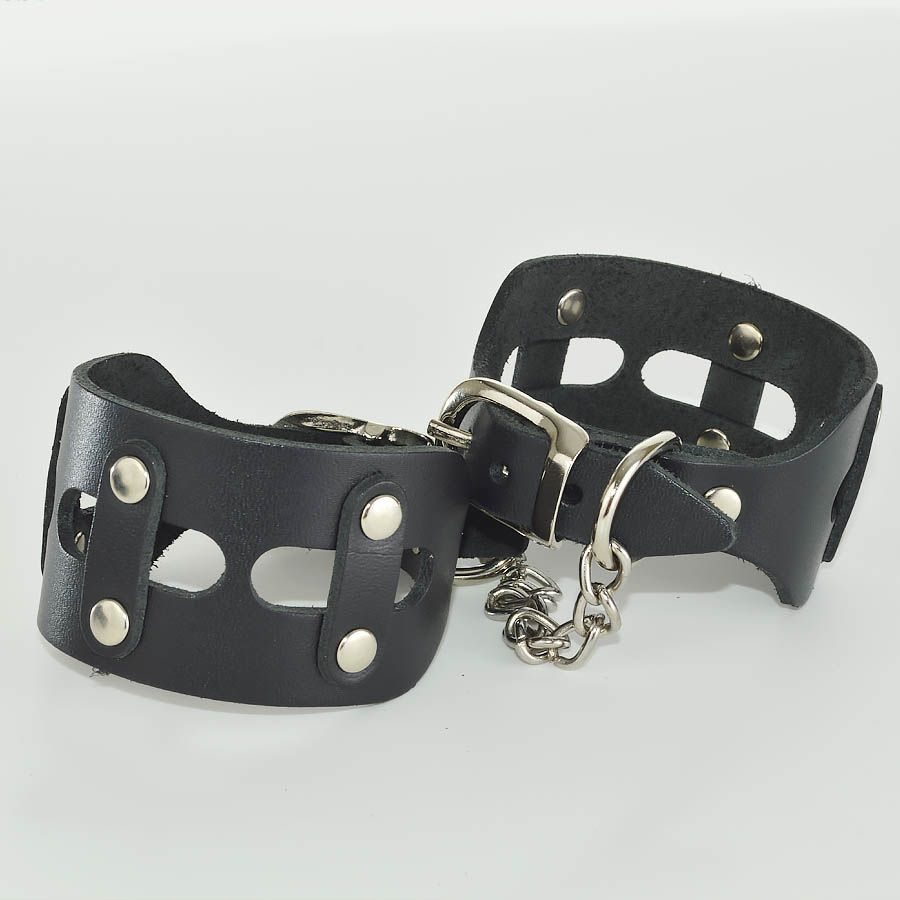 Наручники изготовлены из натуральной кожи. Размер регулируется при помощи металлической пряжки. Наручники соединены цепочкой.