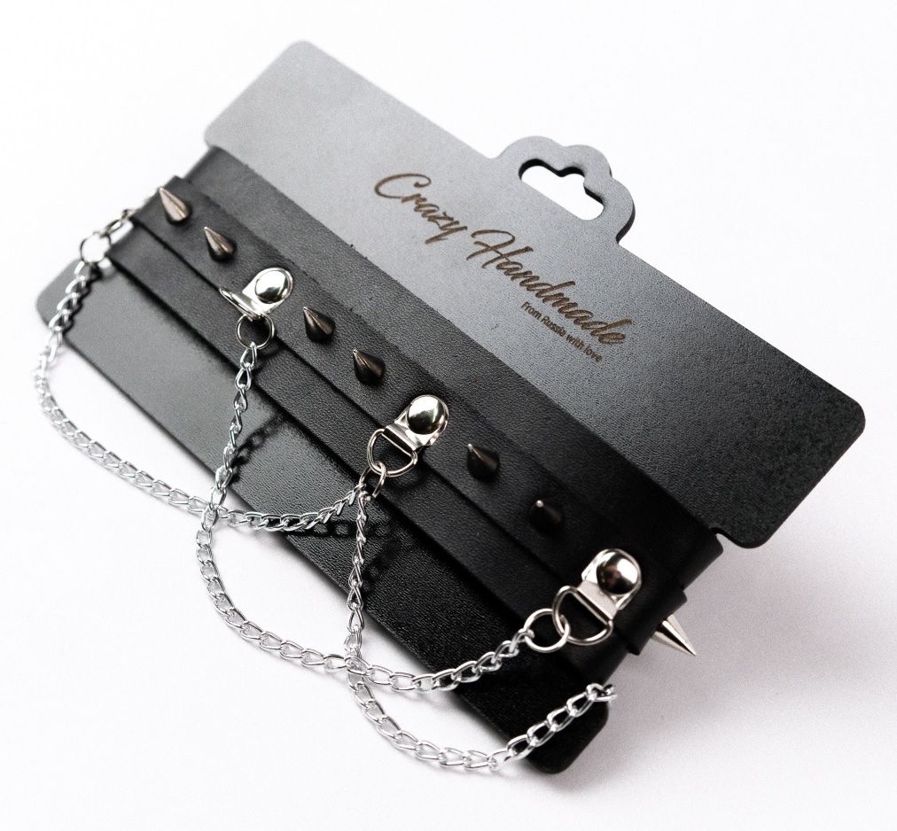 Чокер из натуральной кожи снабжен шипами и декорирован металлическими цепочками.