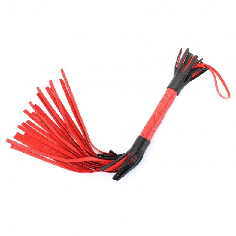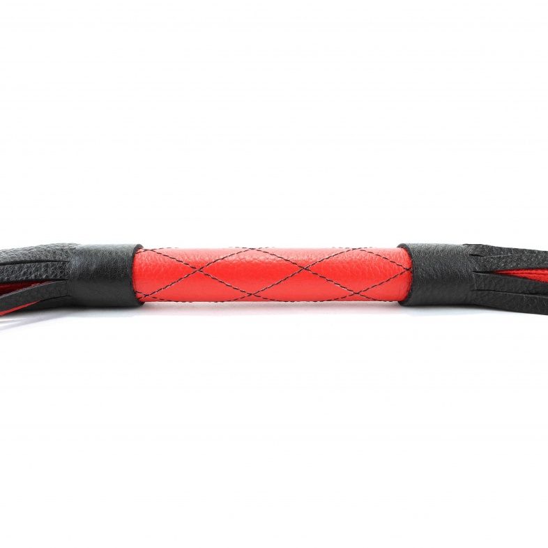 Аккуратная черно-красная плетка, изготовленная из натуральной кожи. Имеет жесткую ручку, также покрытую кожей. Имеется петля для удобного использования плети. Длина хлыстов - 27 см.