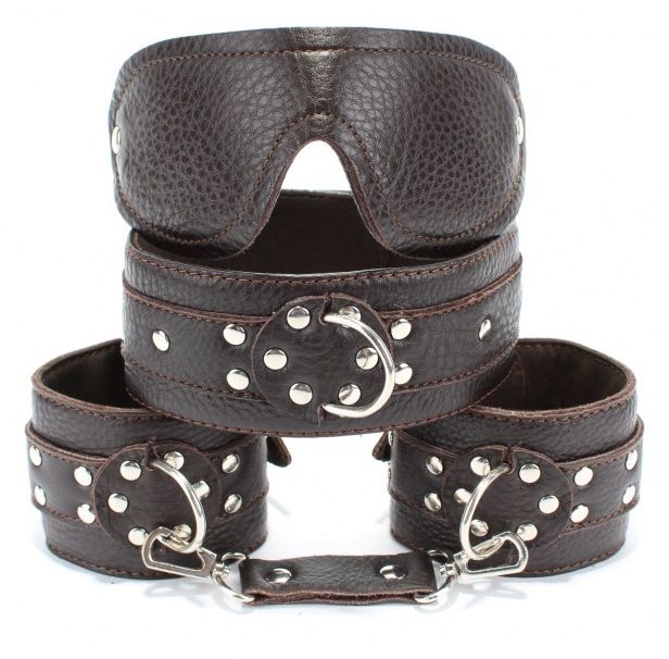 Набор БДСМ-аксессуаров из мягкой кожи черного цвета. В комплекте: маска на глаза, ошейник, манжеты-наручники.