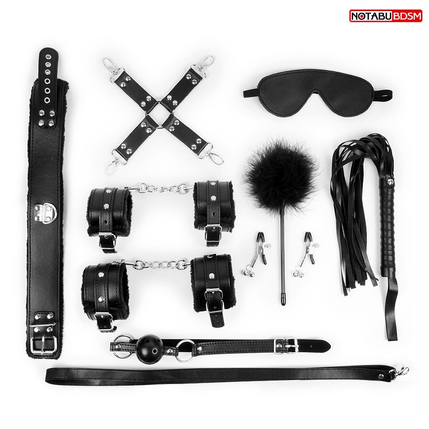 Великолепный набор аксессуаров для любителей БДСМ. В комплект входят кляп, наручники, оковы, ошейник, поводок, верёвка, маска, плеть. Кляп состоит из пластмассового шарика с отверстиями для дыхания и ремней с возможностью регулировки размера. Наручники и оковы снабжены металлической цепочкой, которая позволяет скреплять изделия вместе. Внешняя сторона наручников, оков, ошейника и маски выполнена под кожу, внутренняя отделана мехом, который предотвращает натирание кожи. Плеть-флогер состоит из хвостов и отделанной искусственной кожей рукоятки с петлей. В комплекте: маска, кляп, зажимы, плётка, ошейник, наручники, оковы, щекоталка, фиксатор.