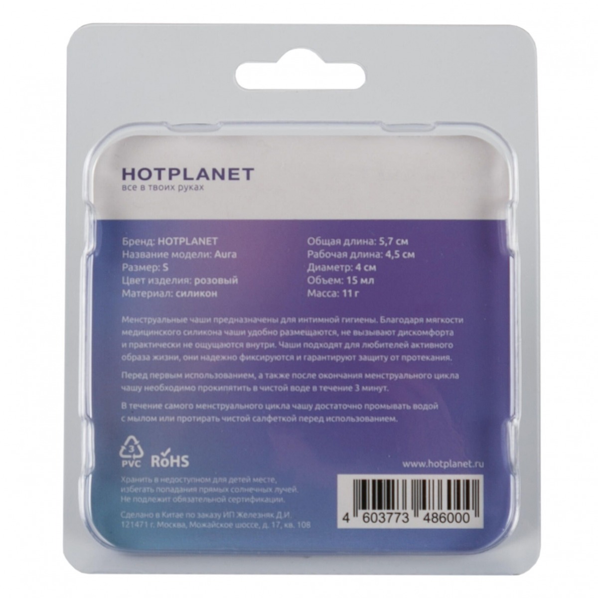 Hot Planet Aura — менструальная чаша из мягкого медицинского силикона, гигиеничного и безопасного для здоровья. Чаша удобно размещается внутри и не вызывает никакого дискомфорта. Она абсолютно незаметна под любым бельем и совсем не ощущается. С Aura вы можете заниматься спортом, плаванием, посещением спа и не бояться протеканий. В отличие от одноразовых средств гигиены, менструальная чаша не впитывает выделения, а собирает их. Благодаря этому она безвредна для естественной микрофлоры и подходит для многоразового использования. При помощи удобной петельки можно легко извлечь чашу после использования. Помимо удобства, менструальная чаша экологична и помогает экономить деньги, ведь при правильном уходе она служит годами, избавляя от необходимости покупать тампоны и прокладки. Менструальная чаша — единственное средство женской гигиены, которое позволяет отслеживать объемы кровопотери. Средняя кровопотеря в сутки составляет 50-70 мл (в норме до 80 мл), а кровопотеря за один менструальный цикл — не более 250 мл. Зная объем менструальной чаши, можно легко сравнить объемы потерянной крови с нормой и держать свое здоровье под контролем. Объем - 15 мл.