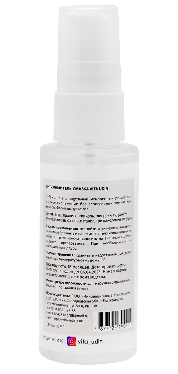 Лубрикант для влюблённых VITA UDIN принесёт яркое наслаждение и максимум удовольствия. Интимный гель-смазка добавит в ваши отношения нотку лёгкости и страсти. Не имеет отталкивающего резкого запаха. Смазка на водной основе, соответственно, не оставляет следов на белье, одежде и смывается обычной водой. Не доставит вам никаких дополнительных неудобств! Имитирует естественную смазку и не изменяет микрофлору влагалища. Обеспечивает комфортное нежное скольжение без липкости. Не вызывает молочницу, аллергию, раздражение, потому что имеет естественный pH. Выступает как заживляющее средство при микротрещинах или пересыхании слизистой. Можно использовать со всеми типами презервативов и секс-игрушек. Окунитесь в мир ярких вкусовых и приятных ощущений вместе с VU! Наслаждайтесь друг другом столько, сколько просит ваша душа.